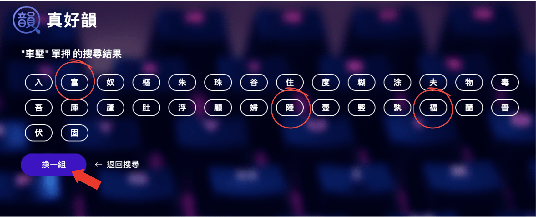 真好韻可以讓你選擇單押、雙押、三押、到四押,但我比較常用單押,會跳出來的字比較多。