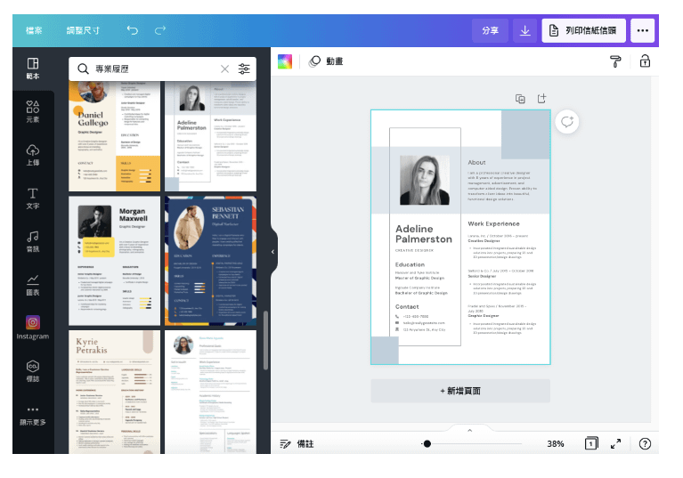 其實有時候我覺得Word也可以排出整潔的簡歷,但是對於不擅長這些工具的人來說,Canva絕對是你的救星,因為連個人履歷都有模板!操作起來不僅非常簡單,使用者友善的程度讓你滑鼠拖拉一下就能有,有簡易履歷、專業履歷,有些模板也有提供1-3頁的樣式,可以供不同內容使用