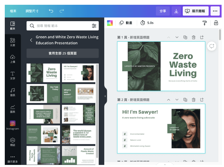 每個模板內都至少有1-25頁不同用途的,例如標題頁、範例說明、頁尾,完全足夠你使用,有時根本也用不上所有的頁面,模板還可以客製色系,把模板的色調改成公司的企業色,不僅美觀又專業!Canva還有內建簡報器功能,簡報的時候一樣會出現時間碼表、螢光筆,甚至是一些互動特效,例如倒數計時器、掌聲歡呼、請大家安靜等,更重要的是!這些功能完全不用下載額外軟體,網頁版也辦得到,意思是,只要有網路的地方,隨時想簡報都可以來上一段!