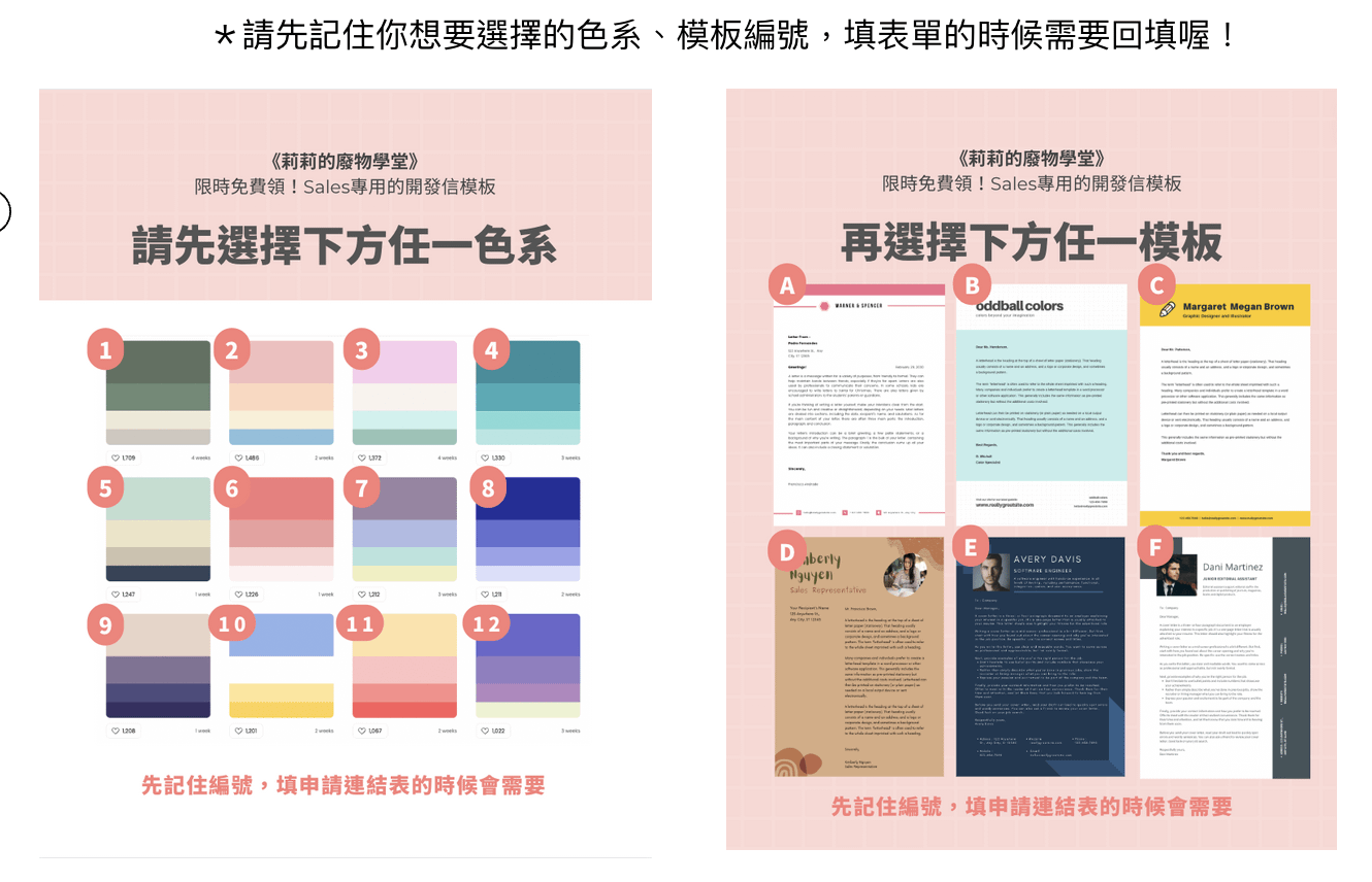 選好色系和模板,記得記下編號,然後回填表單,我就會幫你客製開發信囉